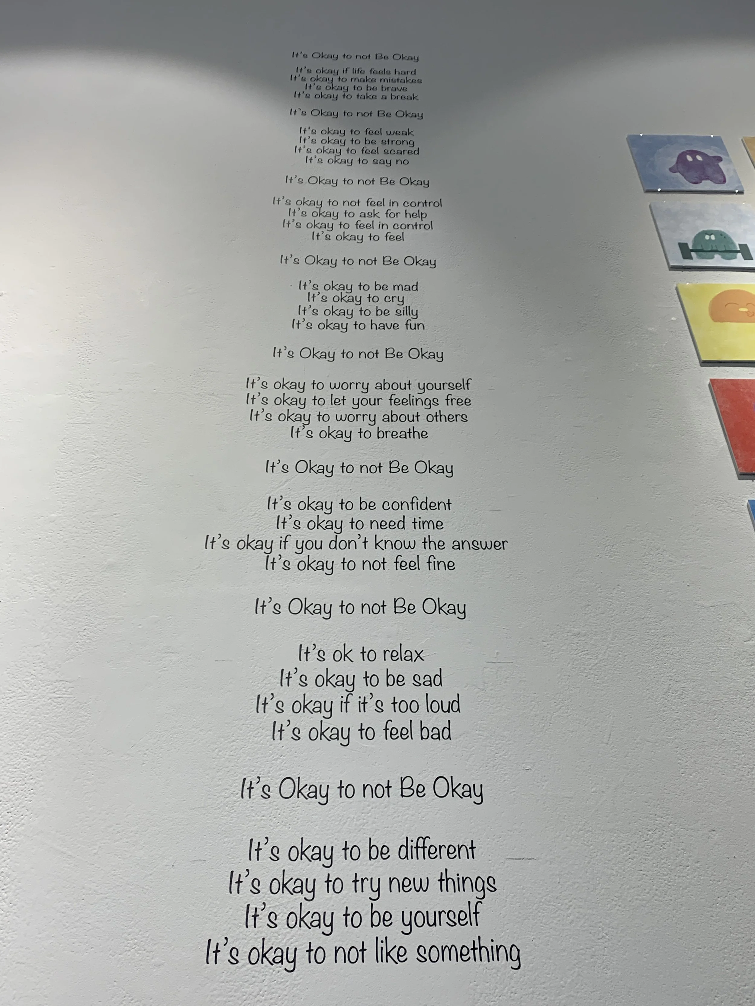 “It’s Okay to Not Be Okay” is a children's poetry book made on the same principle as the title. It’s 46 lines telling the reader in multiple different ways, that it’s okay, they are okay, and everything will be okay.